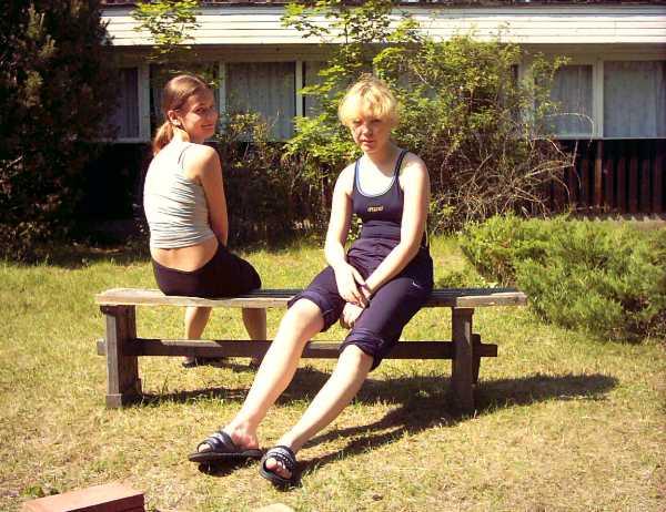 Comments: Vosu renju camp, July 14-17, 2003. Johanna and Ester relaxing on the bench near the table-tennis board. Photographed by Ando Meritee.