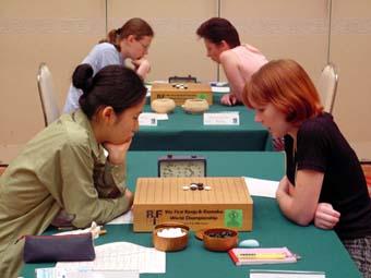 Photo Viewer Title: Mutsumi Tatsutomi vs Yulia Savrasova Comments: World Championship WT, Kyoto 2001. In the front: Mutsumi Tatsutomi vs Yulia Savrasova, Behind: Maris Tuvikene vs Irina Metreveli. Published by Ando Meritee |