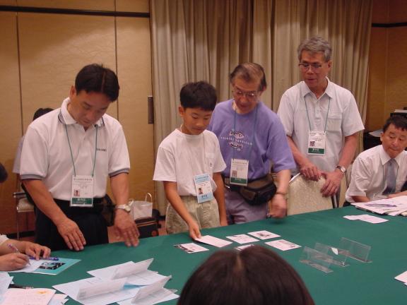 Photo Viewer Title: QT pairing has started Comments: The pairing of the first round of Qualification Tournament has started in Kyoto, 2001. Young boy (maybe Sou Miyagawa?) is picking a number card for someone. The referees are observing the procedure and taking notes. Published by Ando Meritee |