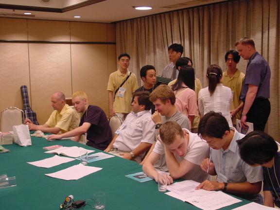 Photo Viewer Title: After QT pairing... Comments: The pairing for the Qualification Tournament has ended in Kyoto, 2001. Now the players are actively discussing the tournament rules and about the first round opponents. Sitting: Tord Andersson, Martin Carlsson, Albert Poghosyan, Vladimir Sushkov, Ando Meritee, Lin Shieng-Min, Cheng Wei-Han. Standing: Korean players Kim, Kwon, Park, Hee, Choi and Anders Henningsson. Published by Ando Meritee |