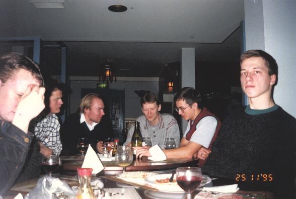 Photo Viewer Title: Estonians and Swedes in Restaurant Comments: After renju tournament, Estonians and Swedes gathered in Restaurant. From left: Soosőrv Ants, Johannesson Rickard, Holgersson Göran, Karlsson Stefan, Tamm Peeter, Meritee Ando.
