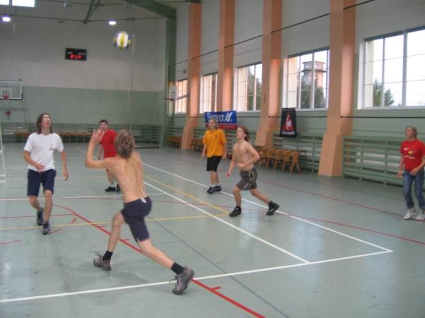Photo Viewer Title: Friendly volleyball match 1 Comments: The friendly volleyball match between renju teams 'Estonia' and 'World' during the Youth European Championship, Syrgavere 2005. On the photo there is Estonian team in action - Mart Kullamaa is lifting the ball to Martin Leis. Siim Sepman is also rushing forward, to be ready to save in case Mart's pass is not precise. The other 3 players (Mati Adamson, Johann Lents, Kaia Kolk) are watching how the combination is played. Published by Ando Meritee |