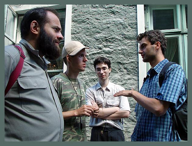 Photo Viewer Title: Renju Players in Tallinn Old Town in 2005 Comments: During the World Championship 2005 in Tallinn, renju players had enough time to walk around the old town of Tallinn. From left: Yuriy Tarannikov, Vladimir Sushkov, Sergey Artemyev and Maciej Nowakowski.