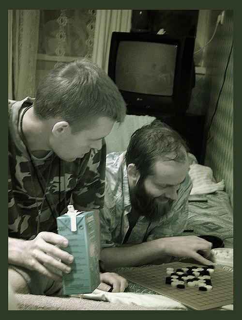 Photo Viewer Title: Vladimir Sushkov and Yuriy Tarannikov Analysing Comments: Vladimir Sushkov and Yuriy Tarannikov are analysing a d11 opening in the hotel room in 2005, during the World Championship in Tallinn.