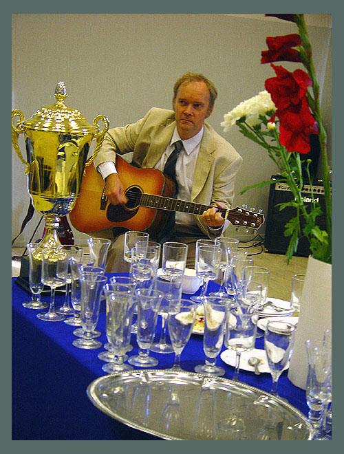 Photo Viewer Title: Peter Jonsson Singing in WC 2005 Comments: Peter Jonsson has many talents. On the photo he is playing a guitar and singing songs. It was the closing banquet of World Championship, Tallinn 2005. On the photo there is also Ando Meritee's world champion trophy.