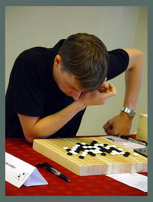 Photo Viewer Title: Must be win somewhere!! Comments: Ando's head is smoking already! Where is the win?? Chingin eventually defended successfully in this long variant of d11 opening and the game ended with draw.