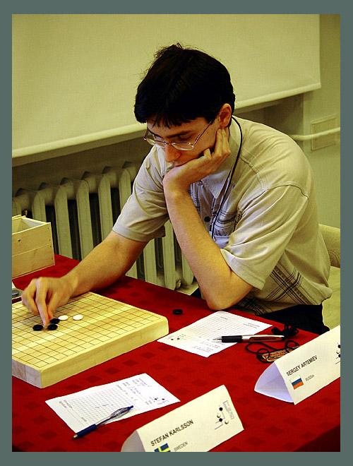 Comments: World Championship 2005. Sergey Artemiev is placing the 5th moves in d11 opening against Stefan Karlsson. Photographed by Mikhail Kozhin.