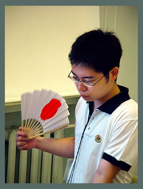 Comments: World Championship 2005. Okabe is holding a nice fan with the image of Japanese flag. Photographed by Mikhail Kozhin.
