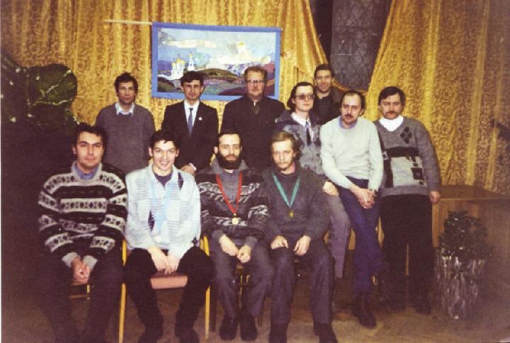 Photo Viewer Title: Participants of Moscow Championship, 1997 Comments: Participants of XV Moscow Championship, 1997. Sitting (from left to right): Dmitriy Krasnonosov (Chief of Moscow section at that time), Oleg Fedorkin (2nd place), Yuriy Tarannikov (1st place), Alexander Mikhailov (3rd place). Standing (from left to right):Sergey Smirnov, Konstantin Nikonov, Sergey Maslyaev, Mikhail Kozhin, Vitaliy Lunkin, Victor Golosov, Pavel Makarov. Published by Yuriy Tarannikov |