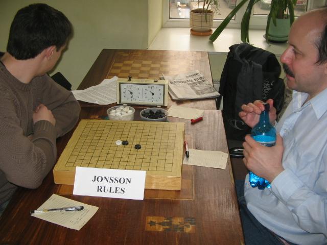 Photo Viewer Title: Jonsson rules, Direct 12 on the board Comments: Moscow Cup 2008. 1/4. Golosov - Kazarin. 3rd game. Jonsson rules. Direct 12 is on the board. Mikhail Kazarin studies the tournament regulation, Victor Golosov drinks the water. Published by Yuriy Tarannikov |