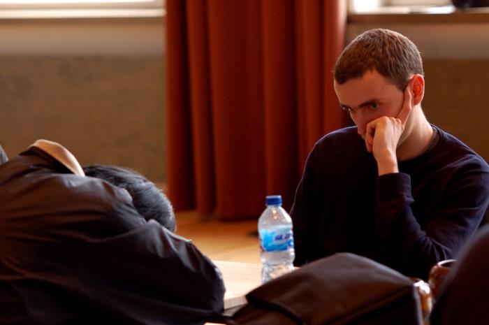 Photo Viewer Title: And what opening is the best for you? Comments: Konstantin Chingin is watching his opponent Wu Hao and thinking of the first moves while the opponent takes the opportunity to get some sleep.