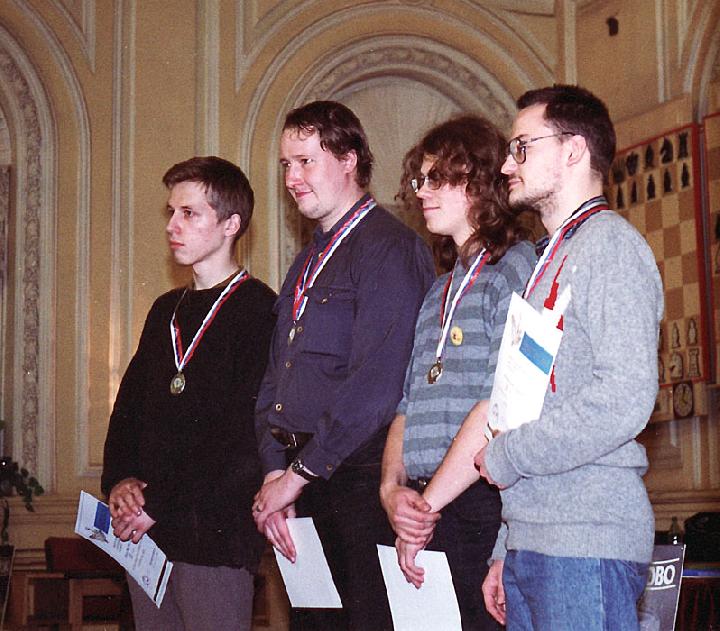 Comments: Team of Estonia - 2 place in TWC-96 From left to right: Ando Meritee, Ants Soosyrv, Margus Tuvikene, Marek Kolk.