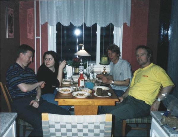 Photo Viewer Title: Friendly supper Comments: Evening meal during Team World Championship 2002 in Vadstena, Sweden. From the left: Vladimir Dvoeglazov, Olga Skuridina, Alexey Skuridin, Peter Jonsson.