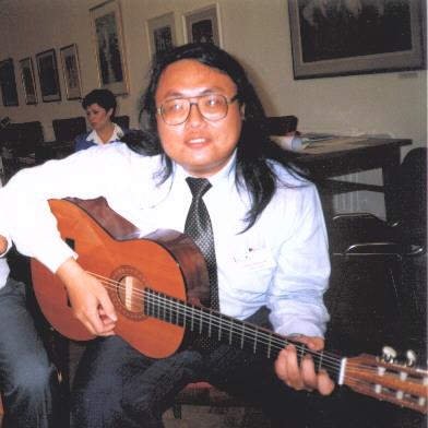 Photo Viewer Title: Chung playing music in WC 1997 Comments: Chung Hsien-Chi from Taipei is giving a nice performance to other renju players, using Ando Meritee's guitar. World Championship, St. Petersburg 1997. Published by Ando Meritee |