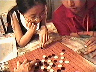Photo Viewer Title: Lu Yao analysing Comments: Young and talented Lu Yao (the daughter of Lu Xiaochun) and other Chinese renju players in the hotel room, during World Championship 1999.