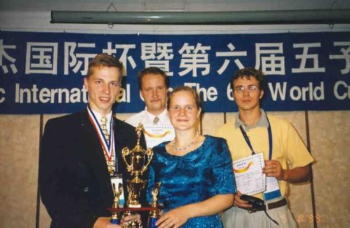 Photo Viewer Title: Estonian delegation in Beijing 1999 Comments: Estonian delegation posing on the stage after the closing ceremony of the World Championship, Beijing 1999.