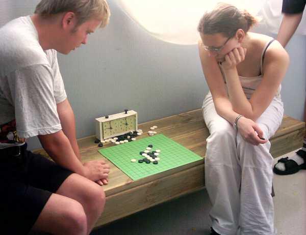Comments: Vosu renju camp, July 14-17, 2003. On the photo: Marko from Finland playing renju with Maris. A tough game. Photographed by Ando Meritee.