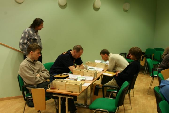 Photo Viewer Title: First tables of Tallinn Open 2005 Comments: Mikhail Kozhin standing. Ando Meritee sitting on left. On the next table Ants Soosyrv and Aivo Oll are playing. On the farmost table Stefan Karlsson is thinking deeply.