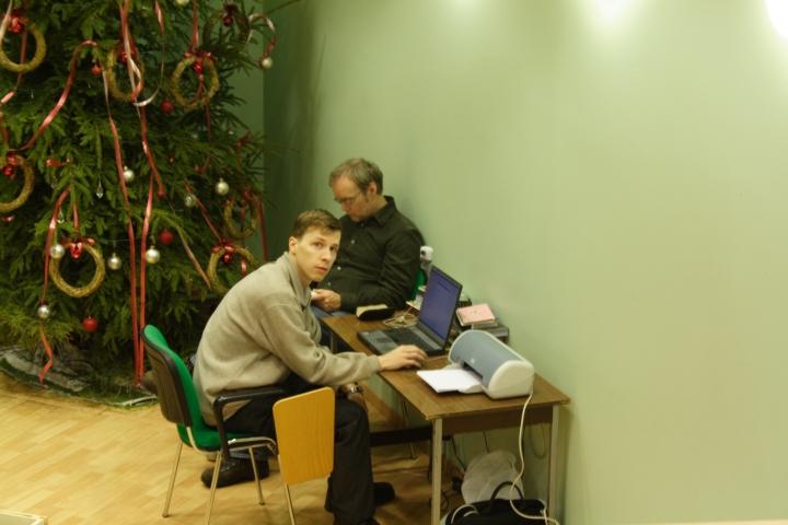 Photo Viewer Title: Before the round of Tallinn Open 2005 Comments: Ando Meritee is preparing the tournament table system in the computer while Peter Jonsson is reading a book nearby the Christmas tree. Published by Ando Meritee |