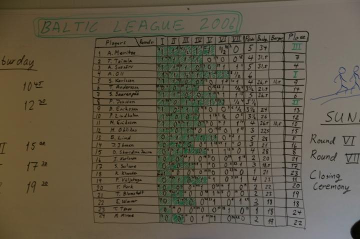 Photo Viewer Title: Tournament table of BL 2006 Comments: Stefan Karlsson had drawn a nice tournament table during the Baltic League in Stockholm. He drew everything except the two blue guys on the right side of the board which he was unable to erase despite several attempts. Published by Ando Meritee |