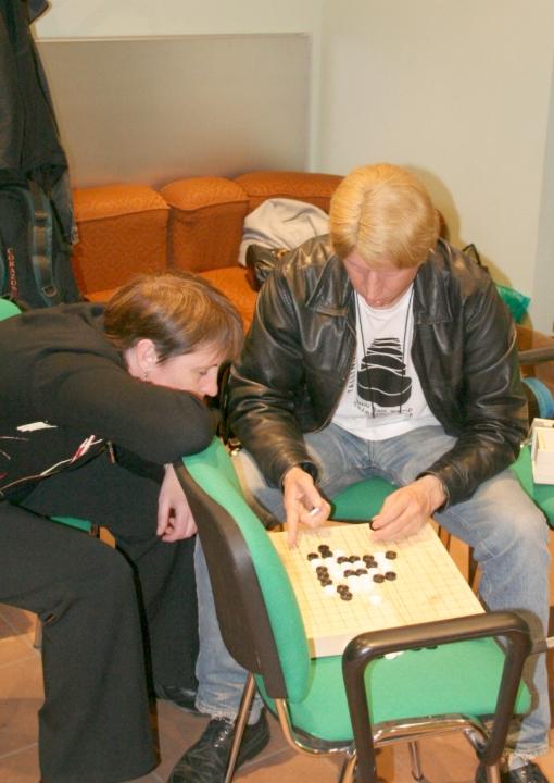 Photo Viewer Title: Metreveli and Skuridin analysing in TWC 2006 Comments: Irina Metreveli and Alexey Skuridin are analysing something on renju board in the backroom of tournament area. Team World Championship, Tallinn 2006. Published by Ando Meritee |