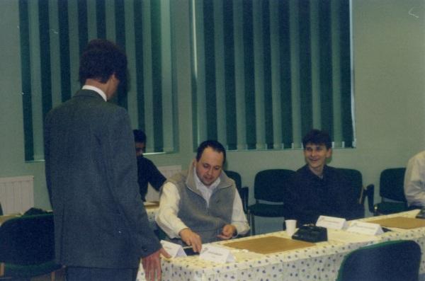 Photo Viewer Title: TWC 2000 1 Comments: Russia I is ready for the round. On the first board is Igor Sinyov, on the second - Alexander Klimashin. The main referee Alexey Skuridin is checking on. Hirouji Sakamoto from Japan team is at the table in the background. Published by Olga Skuridina |